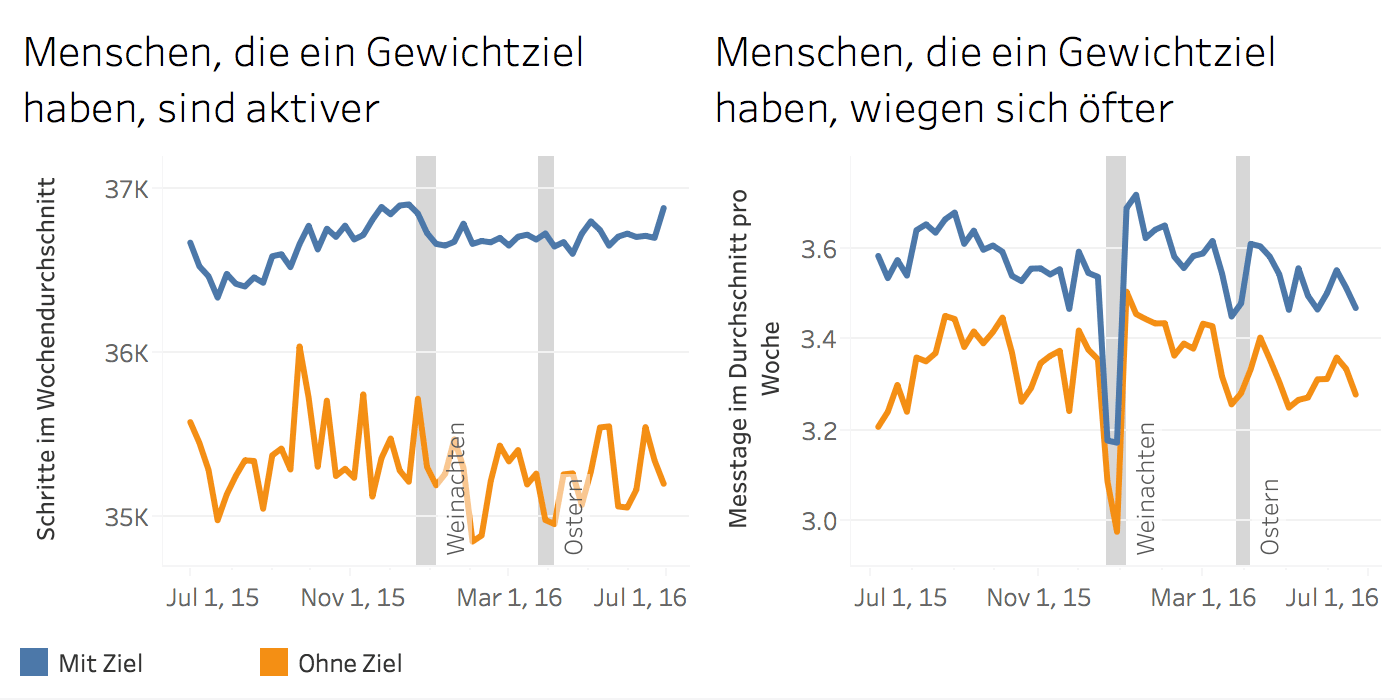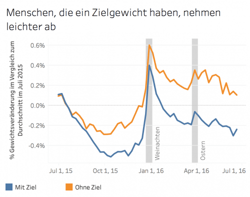 Die Daten aus dem vergangenen Jahr haben gezeigt, dass alle Nutzer im neuen Jahr abgenommen haben. Dabei konnten die Nutzer, die ein Zielgewicht festlegten, deutlich mehr Gewicht verlieren. Im Zeitraum von Juli 2015 bis Juli 2016 gaben sie Abnahmeergebnisse von durchschnittlich 0,3 % ihres Körpergewichts ein. Die Nutzer, die kein Zielgewicht angegeben hatten, verzeichneten in diesem Zeitraum keine Abnahme, obwohl auch sie im Januar etwas Gewicht verloren.