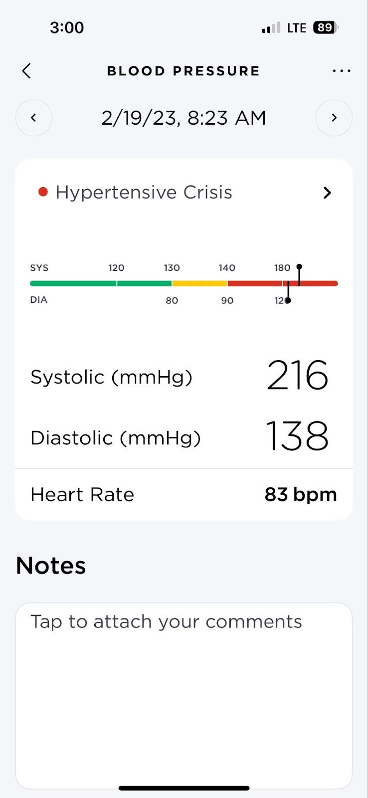„Im Hinterkopf hatte ich dieses Gefühl, dass ich wahrscheinlich irgendwelche Blutdruckmedikamente einnehmen müsste, obwohl ich mich gut fühlte. Gleichzeitig stand die letzte Geschäftsreise für einen Großauftrag an, an dem ich einige Jahre lang gearbeitet hatte, und ich musste dafür zu einer Konferenz nach Dallas. Buchstäblich einen Tag, bevor ich ins Flugzeug stieg, nahm ich mein Gerät in die Hand … und meine Blutdruckwerte waren wirklich hoch.“