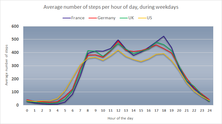 À 5 h 00 du matin, le nombre moyen de pas effectués par les résidents des États-Unis portant un tracker Pulse O2 de Withings avoisine les 100. Évidemment, certains porteurs du Pulse O2 sont encore au lit, ce qui signifie que bon nombre d’entre eux font plus de 100 pas aux aurores. Une heure plus tard, à 6 h 00, la moyenne de pas effectués atteint le nombre impressionnant de 200. C’est peut-être parce que les Américains aiment aller courir tôt le matin, avant d’aller travailler. Mais cela peut aussi signifier qu’aux États-Unis, les gens s’en vont travailler bien plus tôt qu’en France, en Allemagne ou au Royaume-Uni. En regardant les données pour 18 h 00 sur ce même graphique, on s’aperçoit également qu’aux États-Unis, le pic d’activité de fin d’après-midi a lieu un peu plus tôt. Ceci peut signifier que les Américains quittent le travail plus tôt également. Pensez-vous que cela soit lié à l’heure de lever moyen de la population US ? Si vous êtes l’un d’entre eux, faites-nous part de vos idées.