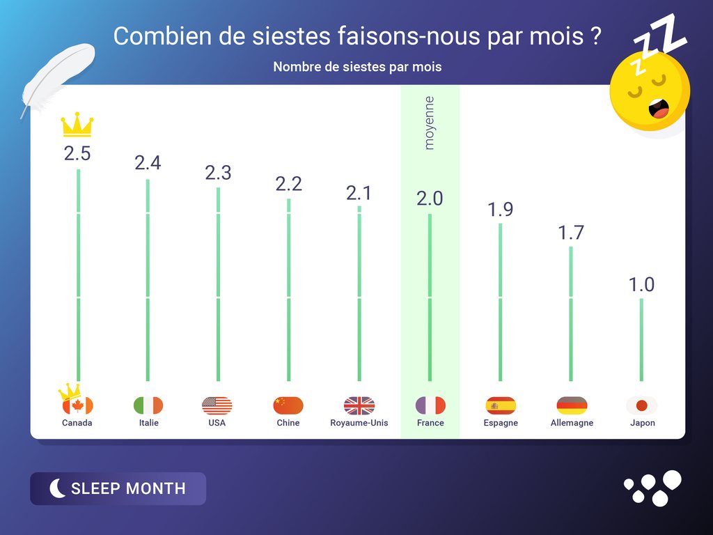 Pour certains pays, la sieste est depuis toujours, part intégrante de leur culture, qu’il s’agisse des siesta du début d’après-midi pour les Espagnols ou de l’inemuri, sorte de sieste en public, au Japon. Mais avec la globalisation, ces pratiques séculaires ont-elles survécu ? La première chose qui a intéressé votre équipe Data était l’heure à laquelle les gens siestaient. En moyenne, nous piquons du nez autour de 14h40. Jusqu’ici rien de très surprenant. Nous sommes tous habitués à la fameuse pause post-prandiale, ce coup de barre qui arrive au moment de la digestion. La sieste est souvent une bonne solution pour repartir d’un bon pied dans l’après-midi.Mais si on regarde de plus près, que voit-on ? Apparemment, les siestes ne sont pas si fréquentes que cela… En fait, quand on se concentre sur les siestes de chaque pays, ceux qui font le plus de siestes, environ 2,5 siestes par mois, sont les canadiens et ceux qui en font le moins, à peine 1 par mois, sont les Japonais.