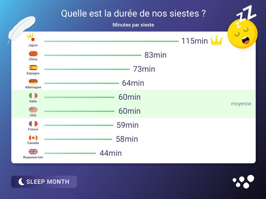 La durée de nos siestes varie énormément entre les pays. Les siestes japonaises durent près de 2 heures (1H55) tandis qu’au Royaume Uni, on ne dort qu’environ 44 minutes par sieste.À nouveau, le Japon fait figure d’ovni. La durée exceptionnelle de leurs siestes contredit “l’inemuri”, qui sont au contraire de très courtes périodes de sommeil. Comme nous l’avions dit, il est possible que ces mini-siestes soient simplement difficiles à percevoir pour nos produits. Cependant, cela pourrait vouloir dire qu’il existe deux types de siestes au Japon : Des mini-siestes et des beaucoup plus longues et profondes, près du double de la durée moyenne des siestes du reste du monde !Il est intéressant de noter que nos utilisateurs japonais dorment également en moyenne une heure de moins la nuit. Leurs nuits durent environ 6h55 contre 7H42 dans le reste du monde. Ce manque à gagner finit peut-être par les rattraper, d’où les très longues siestes !Au Royaume-Uni, c’est exactement l’inverse. Nos utilisateurs ont tendance à faire la sieste moins longtemps mais ils dorment plus longtemps que la moyenne (7h54) pendant la nuit.Voilà pour ce petit tour du monde des siestes de par le monde… Surprenant, n’est-ce pas ?Cette étude a été menée par Withings grâce aux données de sommeil collectées auprès d’environ 135 000 utilisateurs aux États-Unis, Canada, Japon, Chine, France, Allemagne, Royaume-Uni, Espagne et Italie. Withings garantit la confidentialité des données personnelles et protège la vie privée de tous ses utilisateurs. Analyse des données par Eva Roitmann.