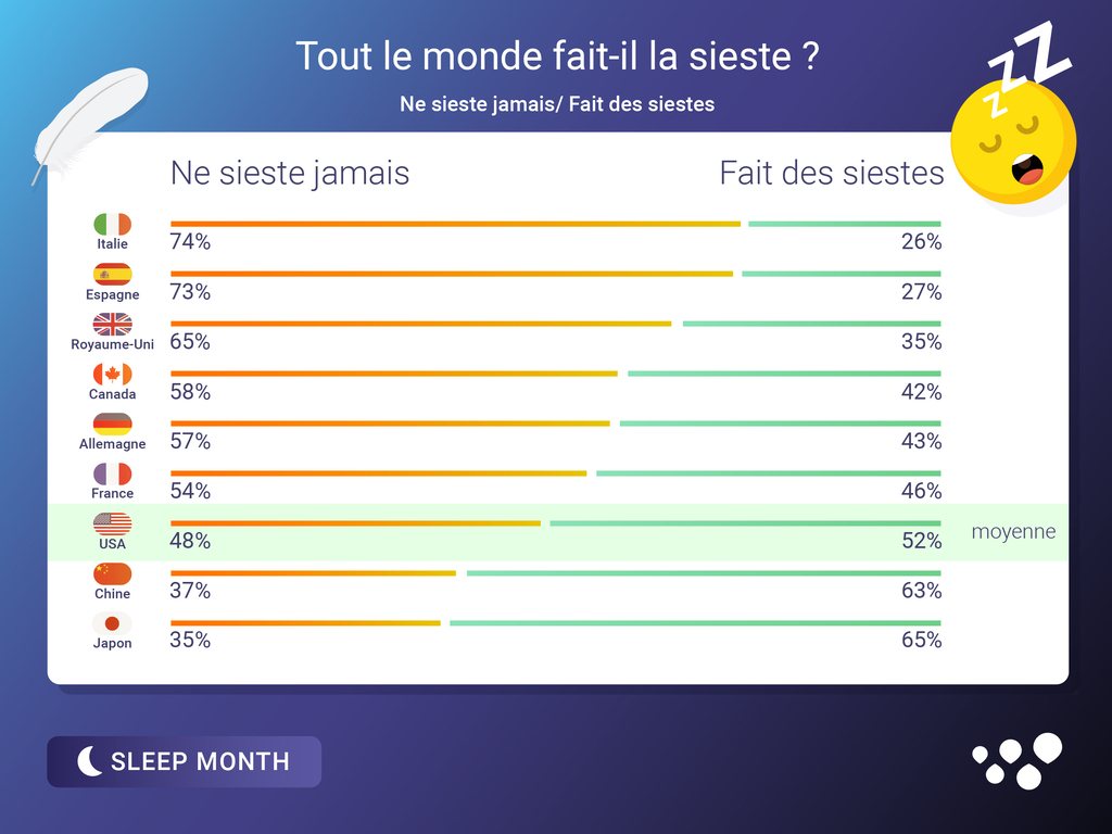 En moyenne, nous ne faisons la sieste que 2 fois par mois et c’est tout ! Clairement, siester ne semble pas faire partie de nos habitudes quotidiennes. Peut-être que nos vies à 2000 à l’heure ne le permettent tout simplement plus…Et si on regardait plus précisément nos utilisateurs dans chaque pays. Est-ce que nous faisons tous (peu !) la sieste ou est-ce que des petits chanceux sont seuls responsables de ces données ? Vous l’avez deviné… 50% de nos utilisateurs ne font pas de siestes du tout ! De plus, lorsqu’on compare les pays, de très grosses différences apparaissent.