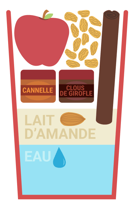 1. Placez les morceaux de pomme, les raisins secs, la cannelle, les clous de girofle et le lait d’amande dans une petite casserole et laissez mijoter à feu moyen pendant environ 7 minutes, en mélangeant de temps à autre.2. Une fois que vous pouvez facilement enfoncer la pointe d’un couteau dans les morceaux de pomme, retirez du feu et laissez refroidir à la température ambiante. (Cette étape peut être évitée si vous utilisez un Vitamix ou tout autre blender adapté aux aliments chauds).3. Placez le mélange dans un blender à grande vitesse et ajoutez l’eau et les noix. Mixez à vitesse maximale pendant 1 minute environ, jusqu’à l’obtention d’une texture lisse et onctueuse.* Si vous utilisez un blender avec un bol en verre, pensez à retirer le bouchon sur le couvercle pour permettre à la vapeur de s’évacuer et commencez par une faible vitesse, puis augmentez-la progressivement.4. Versez dans un mug, ajoutez le bâton de cannelle et servez chaud. (Si vous souhaitez une boisson très chaude, placez-la au micro-ondes pendant environ 45 secondes).