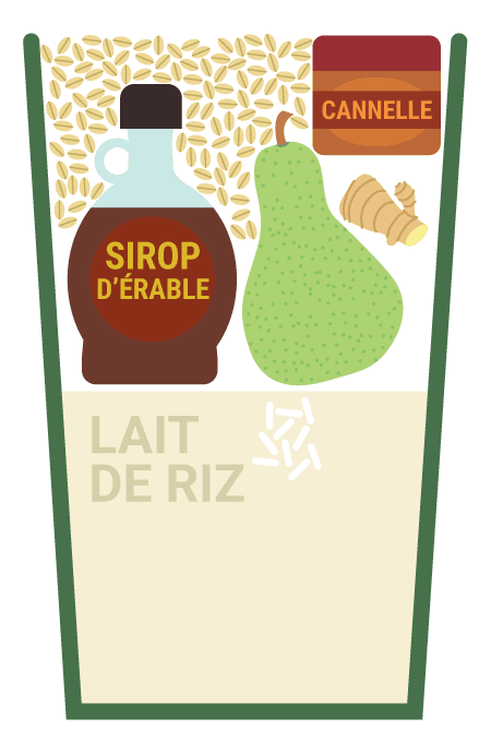 1. Placez le lait de riz, la poire, le gingembre et le sirop d’érable dans une petite casserole sur feu moyen.Laissez mijoter pendant environ 3 ou 4 minutes, jusqu’à la formation de petites bulles à la surface, en remuant de temps à autre.2. Versez le mélange dans un blender à grande vitesse et ajoutez les flocons d’avoine. Mixez à vitesse maximale jusqu’à l’obtention d’une texture lisse et onctueuse.* Si vous utilisez un blender avec un bol en verre, pensez à retirer le bouchon sur le couvercle pour permettre à la vapeur de s’évacuer et commencez par une faible vitesse, puis augmentez-la progressivement.3. Versez dans un mug et décorez d’une pincée de cannelle. (Si vous souhaitez une boisson très chaude, placez-la au micro-ondes pendant environ 45 secondes).