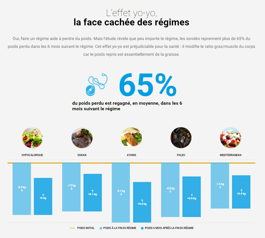 Nous avons sondé plus de 3500 utilisateurs de balances connectées Withings au sujet de leurs habitudes alimentaires et des méthodes utilisées pour maîtriser leur poids. La première conclusion est frappante : les régimes sont inefficaces pour maigrir durablement car le poids perdu finit par être regagné.