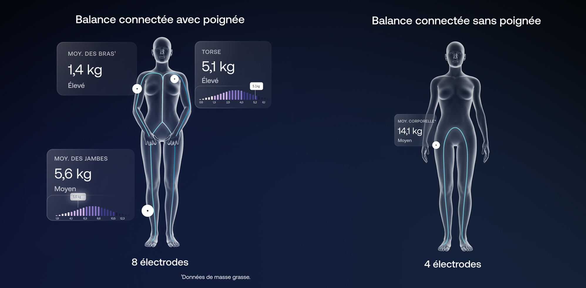 La multi-fréquence : la technologie utilise des fréquences très hautes (jusqu'à 250 kHz) pour pénétrer au cœur des cellules. Cela permet de distinguer l'eau intracellulaire de l'eau extracellulaire pour une analyse ultra-fine, là où les balances classiques doivent souvent estimer ou extrapoler ces données.