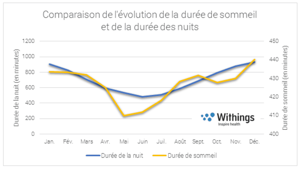 Au cours de l’année, la durée des jours liée à la durée d’ensoleillement évolue : du solstice d’été (plus longue journée) en juin au solstice d’hiver (plus longue nuit) de décembre, les nuits sont de plus en plus longues. Le corps humain qui est sensible au soleil, nous incite à suivre ce rythme, puisque l’on observe globalement que les gens dorment de plus en plus de juin à décembre, puis de moins en moins de décembre à juin.