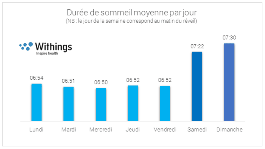 On est bien loin des 8h de sommeil recommandées, c’est le premier constat que nous pouvons faire. La population étudiée dort en moyenne 06h50 la semaine et 07h25 le weekend. La nuit de samedi à dimanche est la plus longue de la semaine avec 7h30 de sommeil en moyenne.