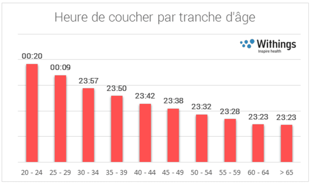 Les habitudes de sommeil par tranche d’âge nous éclairent sur l’évolution des habitudes de sommeil au cours du temps. On observe que plus nous vieillissons, plus nous nous couchons tôt : les 20-24 ans se couchent en moyenne à 00h20 tandis que les plus de 65 ans se couchent à 23h23, soit près d’1 heure plus tôt. L’heure de réveil évolue dans le même sens, à la différence qu’elle ré-augmente à partir de 60 ans, certainement l’effet de la retraite et de la fin des contraintes de réveil. Les plus jeunes se réveillent à 08h17 alors que les plus âgés se lèvent à 07h25. C’est la tranche des 55-59 ans qui se lève le plus tôt, à 07h08.Les plus gros dormeurs sont donc les plus jeunes avec une moyenne de 07h26 de sommeil par nuit tandis que les 45-59 ans dorment le moins (07h02 en moyenne).