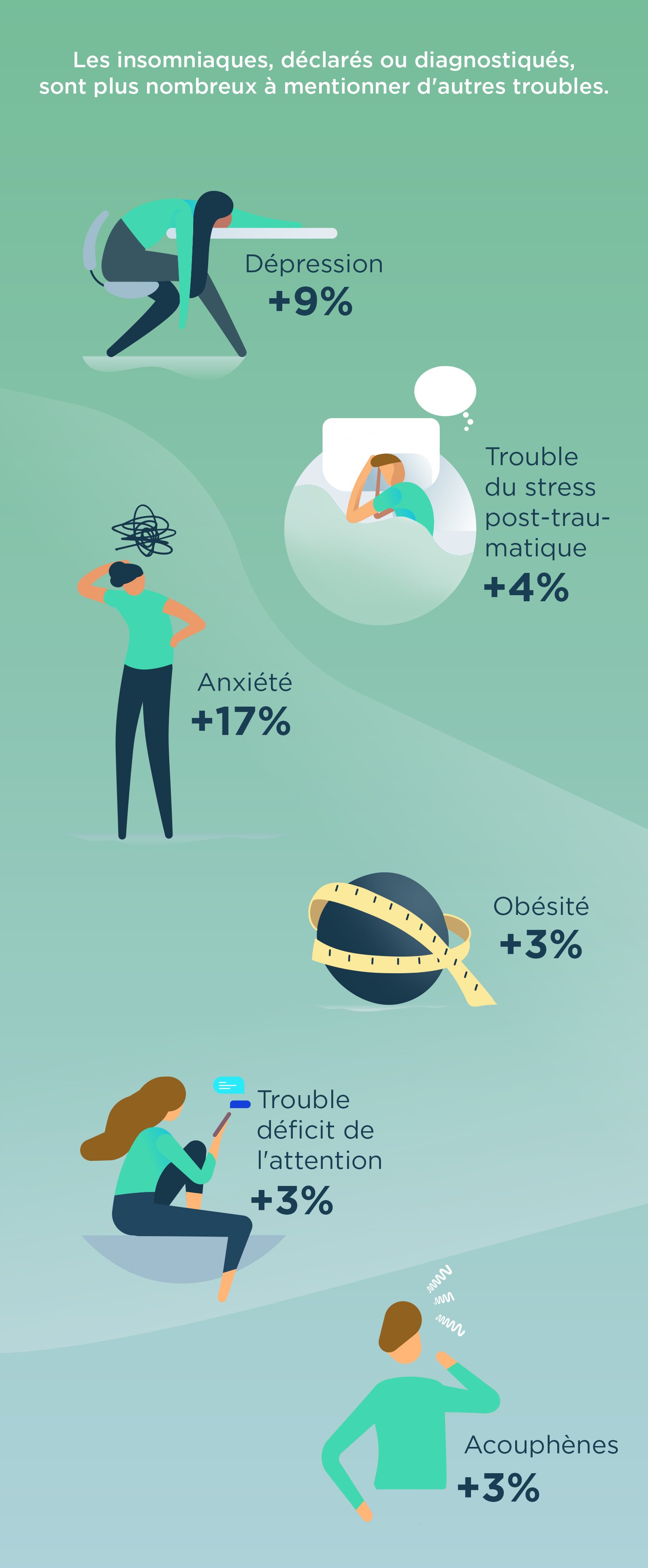 Sur la base des trois critères ci-dessus, nous avons constaté que 12 % de nos utilisateurs non diagnostiqués, pourraient souffrir d’insomnie sans le savoir. Sachant que les insomniaques diagnostiqués et/ou se décrivant comme tels représentent 22 % de nos utilisateurs, les insomniaques représenteraient bien 34% de la population, soit un tiers des adultes dont une partie non-diagnostiquée.Pourquoi une insomnie non-diagnostiquée serait-elle potentiellement une mauvaise chose ? Lorsqu’on a demandé aux personnes insomniaques si elles avaient reçu un diagnostic pour d’autres maladies, elles ont signalé un nombre plus élevé de cas de :