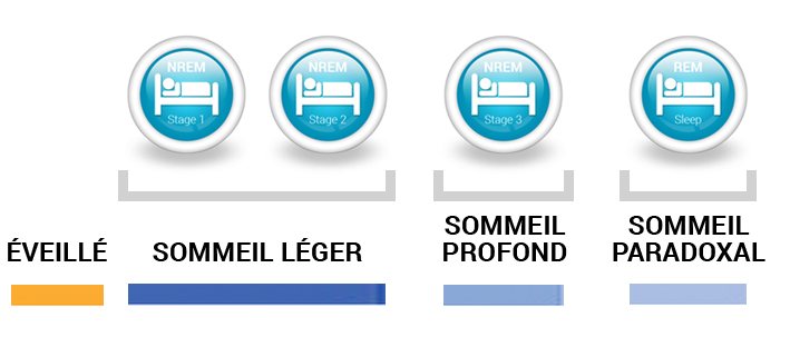 Les scientifiques spécialistes du sommeil ont identifié deux grandes catégories de phases du sommeil :• Les phases au cours desquelles on observe des mouvements rapides des yeux (Mouvements Oculaires Rapides, ou MOR) – en anglais on parle de “REM Sleep”, alors qu’en France on parle de sommeil paradoxal,• Les phases au cours desquelles on n’observe pas ces mouvements involontaires (sommeil sans Mouvements Oculaires Rapides – “NREM Sleep” en anglais). Jusqu’en 2007, les scientifiques divisaient la catégorie NREM Sleep en 4 phases différentes. En effet, cette année là l’American Academy of Sleep Medicine a décidé de fusionner les 3ème et 4ème phases qui ne diffèrent pas fondamentalement : il existe donc aujourd’hui 3 types de NREM Sleep.