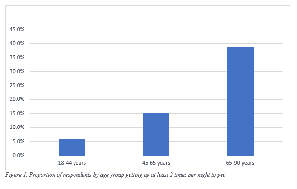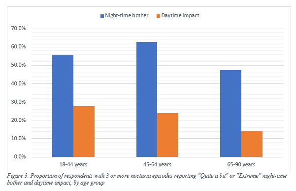 Il est intéressant de noter que les groupes d’âge les plus jeunes étaient plus gênés par la nycturie, tant la nuit que dans leurs activités diurnes, par rapport aux participants plus âgés.Parmi les personnes ayant eu trois épisodes de nycturie ou plus, 55,6 % des 18-44 ans et 62,7 % des 45-64 ans ont déclaré être plus dérangés la nuit, contre 47,4 % des 65-90 ans. Les activités diurnes ont également été affectées : parmi les participants ayant déclaré 3 épisodes de nycturie ou plus, 27,8 % des 18-44 ans et 24,1 % des 45-64 ans ont déclaré que leurs activités diurnes étaient “assez” ou “extrêmement” affectées, contre 14,1 % des 65-90 ans.