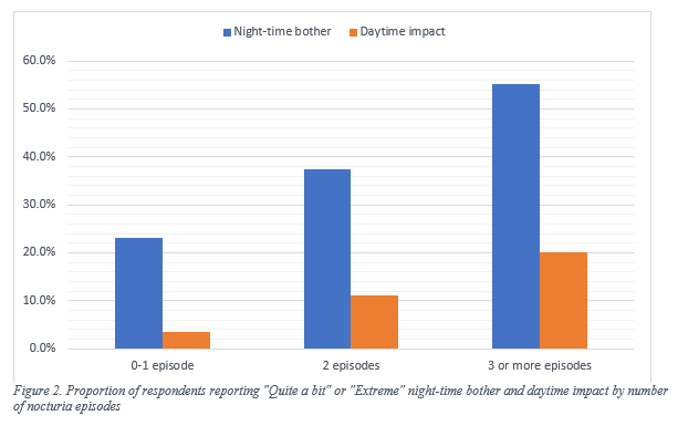 Nous avons demandé aux participants à s’ils étaient dérangés par le fait de se réveiller la nuit pour uriner. Comme prévu, un nombre plus élevé de réveils nocturnes dus à la nycturie était associé à un niveau de gêne plus élevé : 55,3% des participants ayant eu 3 épisodes de nycturie ou plus ont déclaré être “assez” ou “extrêmement” dérangés, alors que seulement 23,2% de ceux ayant eu 0 ou 1 épisode de nycturie ont déclaré ce niveau de dérangement. Les activités diurnes ont également été affectées : 20,1 % des participants ayant eu 3 épisodes de nycturie ou plus ont déclaré avoir été “assez” ou “extrêmement” affectés dans leurs activités du lendemain.